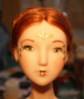 I was inspired in part by the Muses in Girl Genius , and my desire to do a Steampunk doll. I refrained from gluing random gears on her. If I'm going to have gears, they're going to be FUNCTIONAL. Some of her decorations do hint at gears, though.